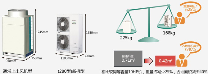 室外機組采用側出口空氣小型化、輕量化設計,型號尺寸為1650(H)×1100(W)×390(D),與同容量的普通產品相比,大大減少了占用面積和重量。